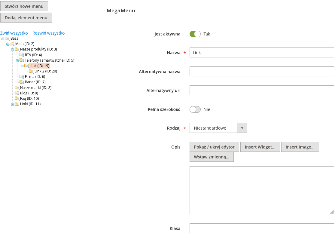 Opcja Pełna szerokość pokaże dany element menu na całą szerokość strony