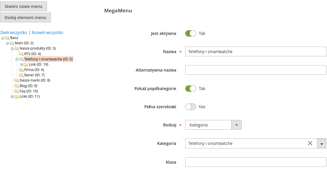 Opcja Pokaż podkategorie doda do menu podkategorie wybranej kategorii