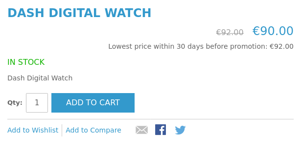 Moduł monitoruje (śledzi) wszystkie zmiany cen oraz promocje w sklepie. Na podstawie tych danych (jeśli produkt jest w promocji) pokazuje jego najniższą cenę na stronie z ostatnich 30 dni od dnia: